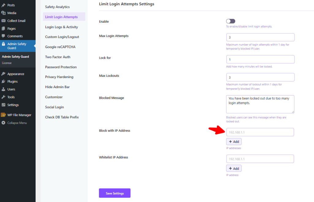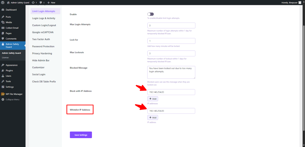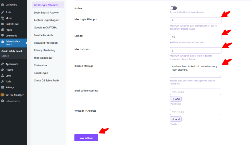 Let’s configure the limit login attempts settings first, to proceed to the Whitelist IP Address