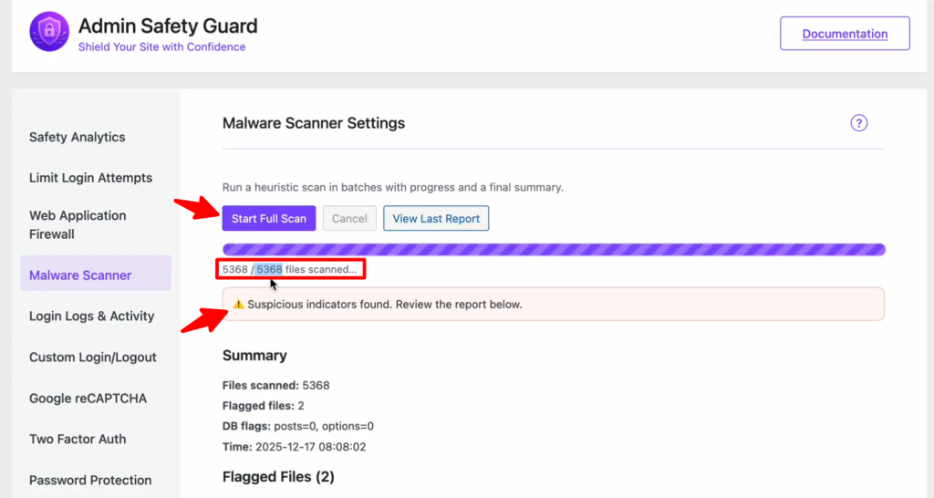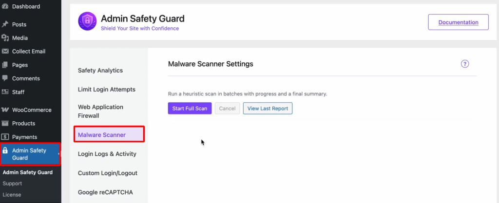 • Log in to your WordPress site and navigate to Admin Safety Guard → Malware Scanner