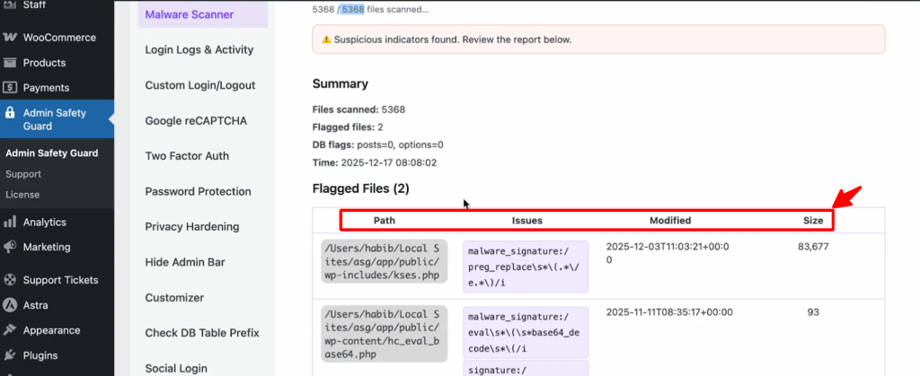 • In the table, you will find details such as the file path, the reason it was flagged as malware, the modification date, and the file size.