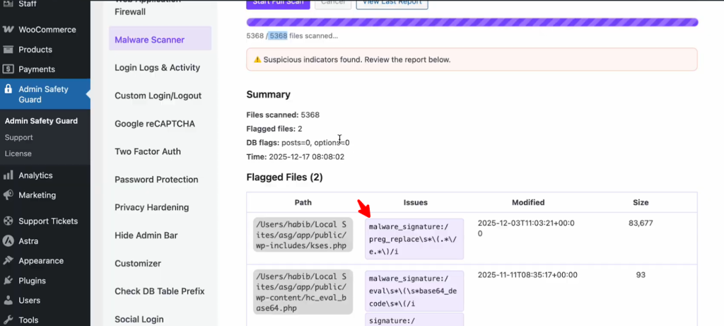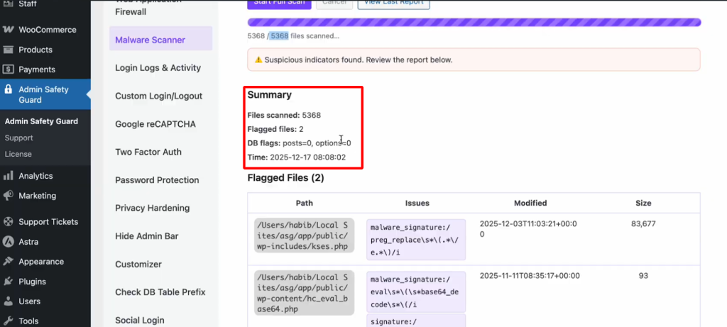 • Whenever the plugin detects a file matching a malware signature, it marks the file as suspicious and flags it, placing it in the malware scanning summary table.