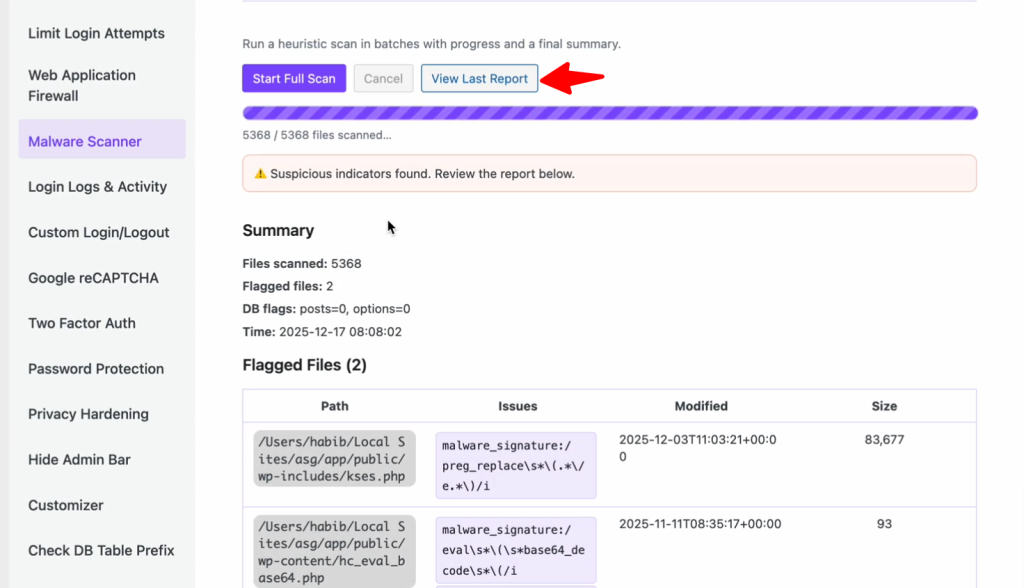 • You can click on “View Last Report” to see the most recent malware scanning report.