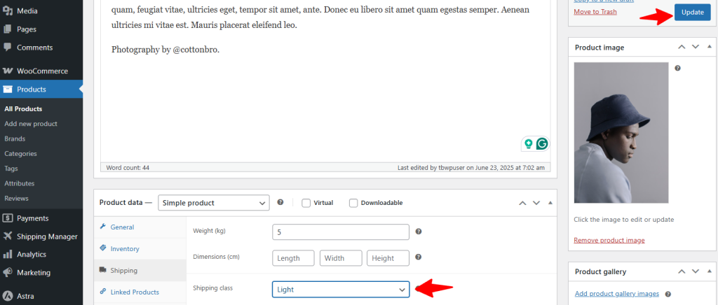 Now, let’s change the product’s shipping class to lightweight. Then update the product.