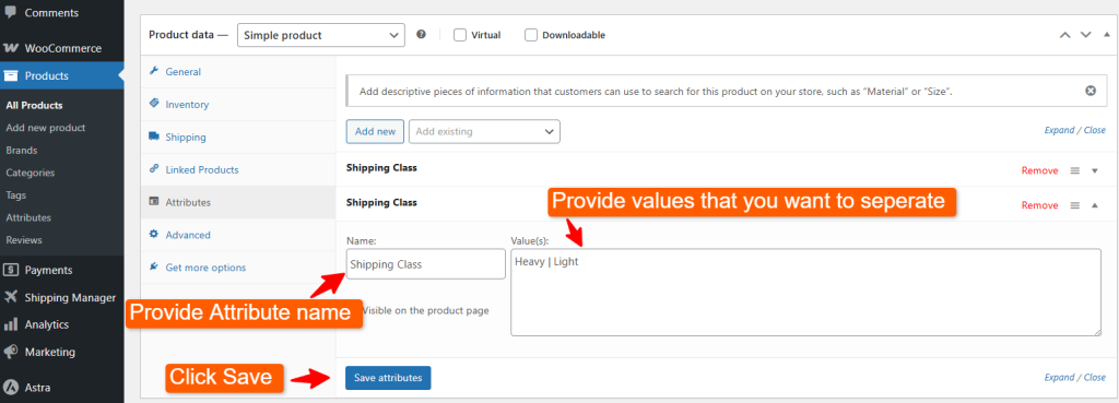 Now provide the Shipping Class name, Slug, and Description of the class. Then click the Create button. So, one product can have two different variations when it comes to weight, color, and other categories.