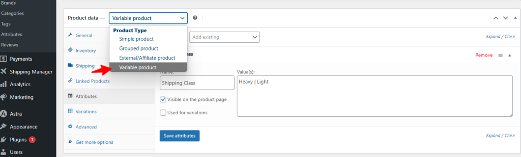 Now, you need to make this product a variable product. Simply select Variable product from the Product data.
