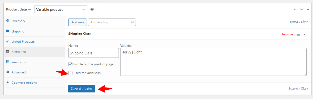 Now go back to the Attributes tab and select your created attribute. Then place a tick mark on Used for variation and click the Save attributes button.