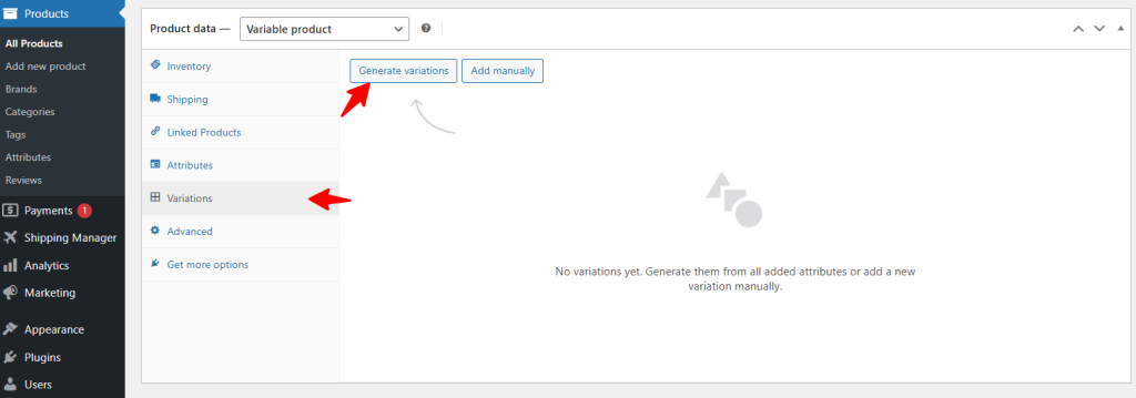 Now go to the Variations tab and click Generate Variations to create variations from the attributes.
