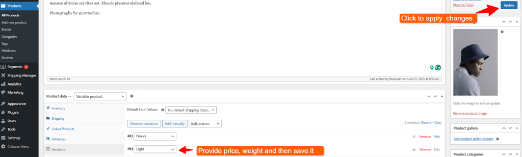 As you can see, now there are two product variations named Heavy and Light. Click edit to insert the necessary data on the product variations.