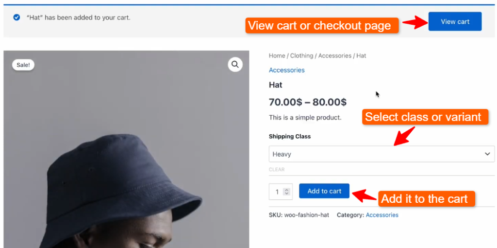 As you can see, there are two variants which you can select from the Shipping class. Click the Add to cart button and then click View Cart or go to the Checkout page.