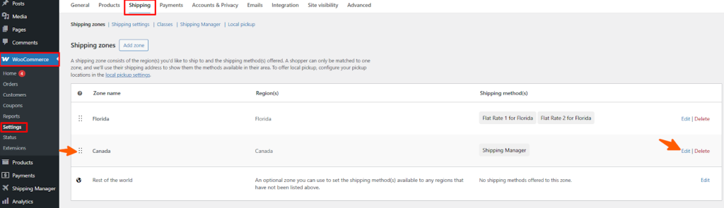 First, navigate to WooCommerce > Settings and then click Shipping. Now, you can see that two zones have been created already. Click Edit to customize the shipping rules of that zone and apply a shipping fee based on the Shipping Class.