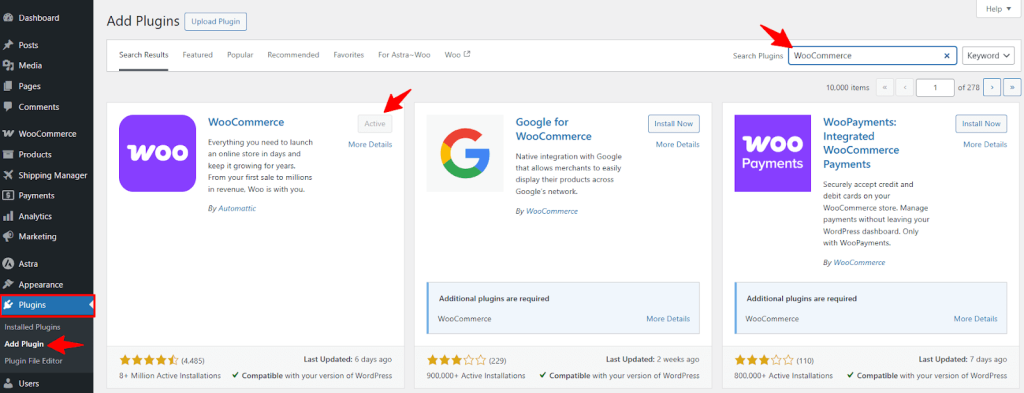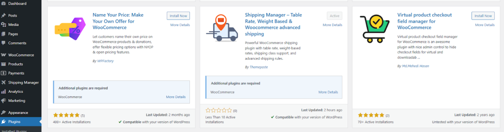 Next, you need WooCommerce to make the Shipping Manager plugin functional. So, navigate to Plugin > Add Plugin. Then search for WooCommerce, click Install, and Activate the plugin.