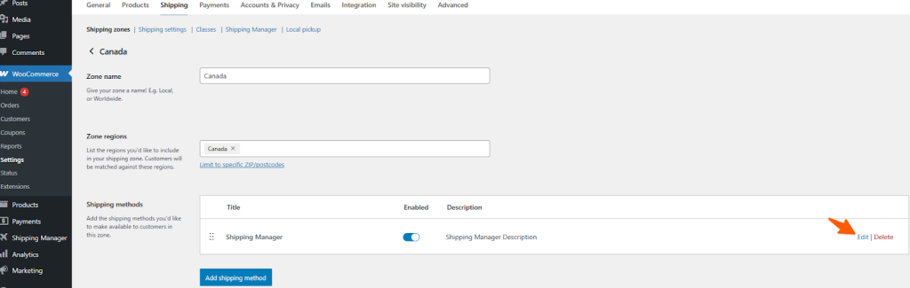 In the next section, you will see the available shipping methods. You can also create a new shipping method by clicking the Add Shipping Method button. Now, click the Edit button to add or customize the shipping rules.