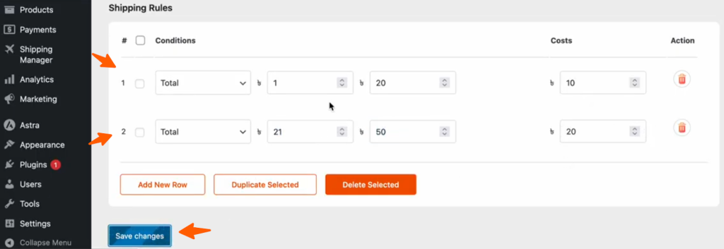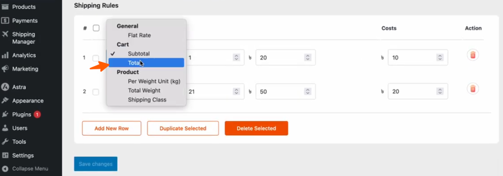 After selecting Total, set the price range for the subtotal. We’ve set the first Total between $1 – $20, and the shipping cost as $10. The second Total is between $21-$50, and the shipping cost is $20. Then click Save Changes to apply the changes.