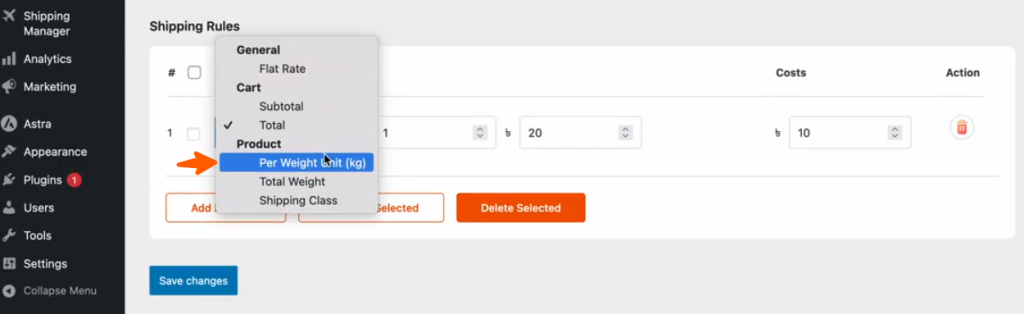 Now, you can view the shipping rules available on the list and select Per Unit Weight (kg) from the list.