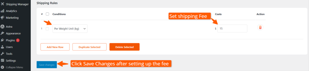 After selecting Per Unit Weight (kg), set the shipping fee for products per unit (kg). We’ve set the shipping fee at $15.