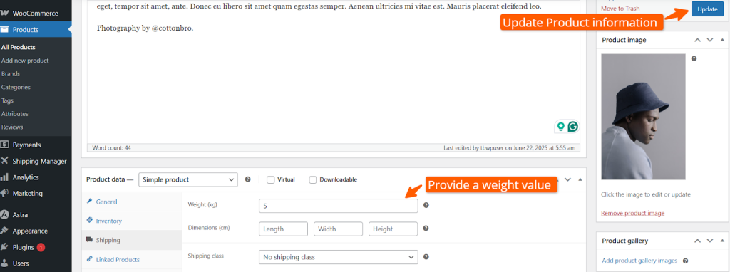 Scroll down a bit and click Shipping, and set the weight value. We’ve set the weight to 5kg for this instance. Then scroll up and click the Update button.