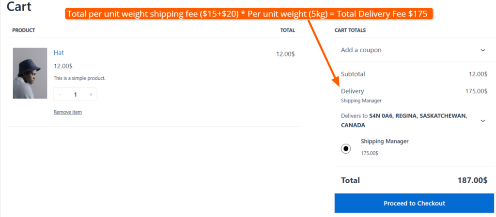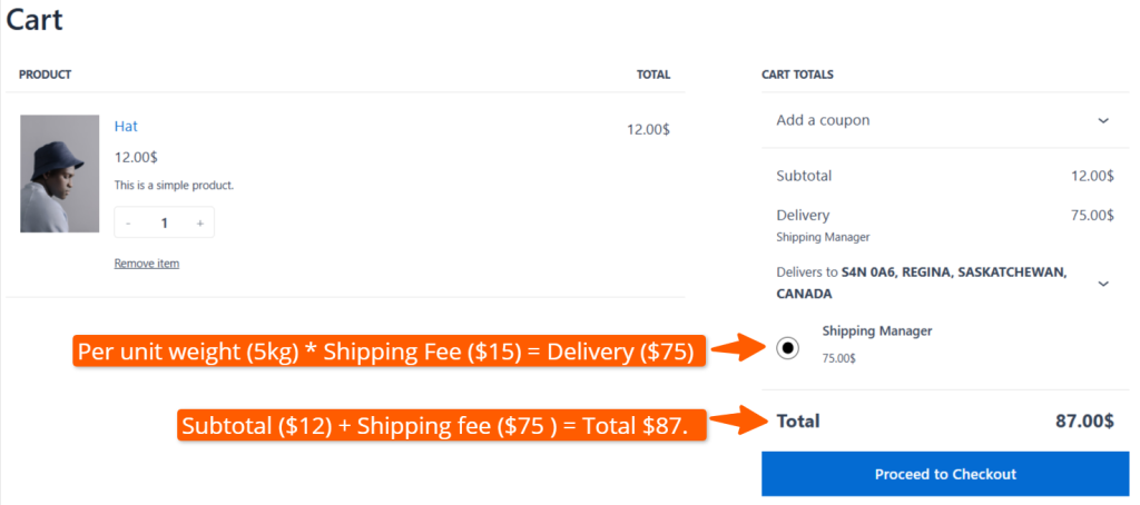 So, the shipping cost becomes per unit weight (5kg) * Shipping Fee ($15) = Delivery ($75). Ultimately, the subtotal ($12) + Shipping fee ($75 ) = Total $87.