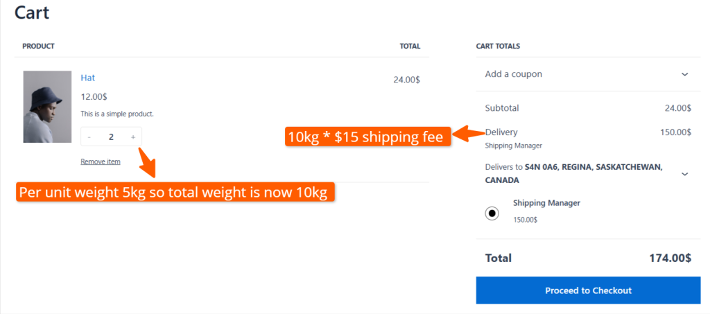 Now, let’s add two similar products to the cart, which makes the per-unit weight 10kg. So, the shipping fees become per unit weight (10 Kg) * Shipping fee ($15) = $150.