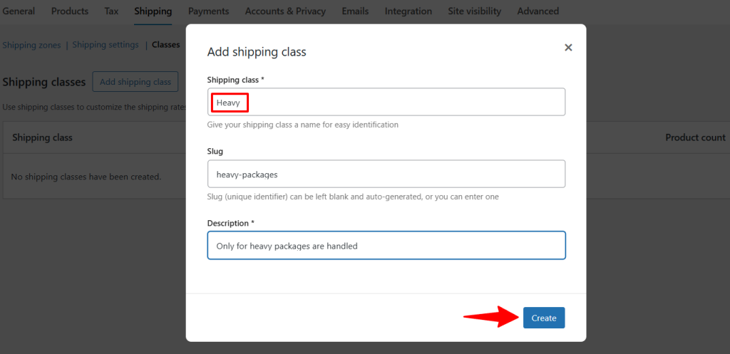 - Click “Create” to save each shipping class.