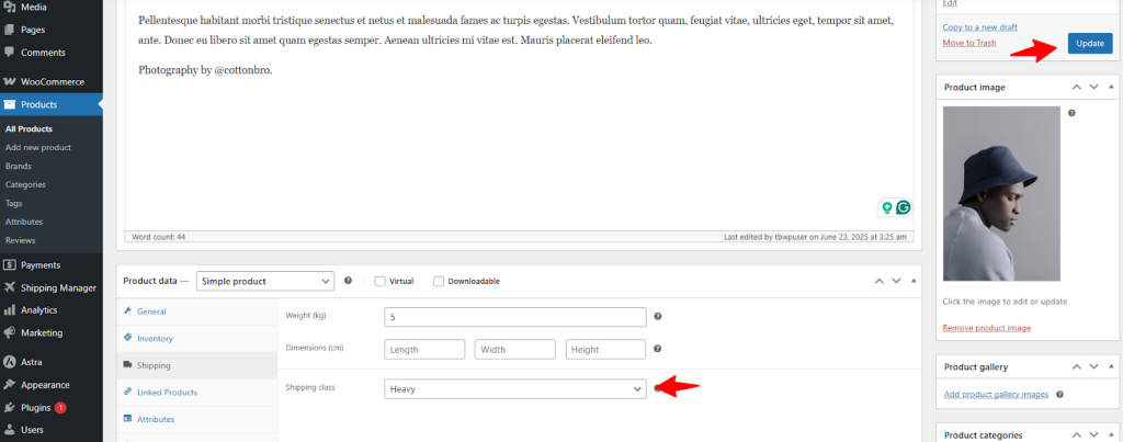 - Click “Update” to apply the shipping class to the product.