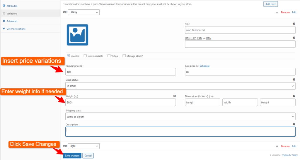 - Under “Attributes,” add options like “Weight: Heavy, Light.”